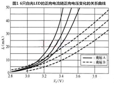 图1给出了随机抽取的6只白光LED(其中A商标和B商标各3只)的正向电流IF随正向电压tiE变化的关系曲线。如果用恒定电压驱动这6只(相并联)LED,它们之间的正向电流相差较大,例如用3.4V驱动,正向电流范围为l0~44mA,这就使得各只LEDˉ的亮度和色度存在较大的差异。